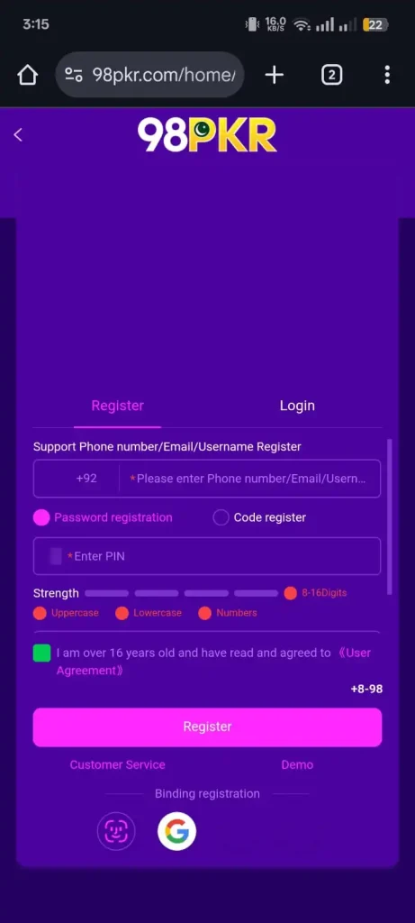 Tap the “Register” or “Create Account” button on the home screen. - Enter Your Mobile Number